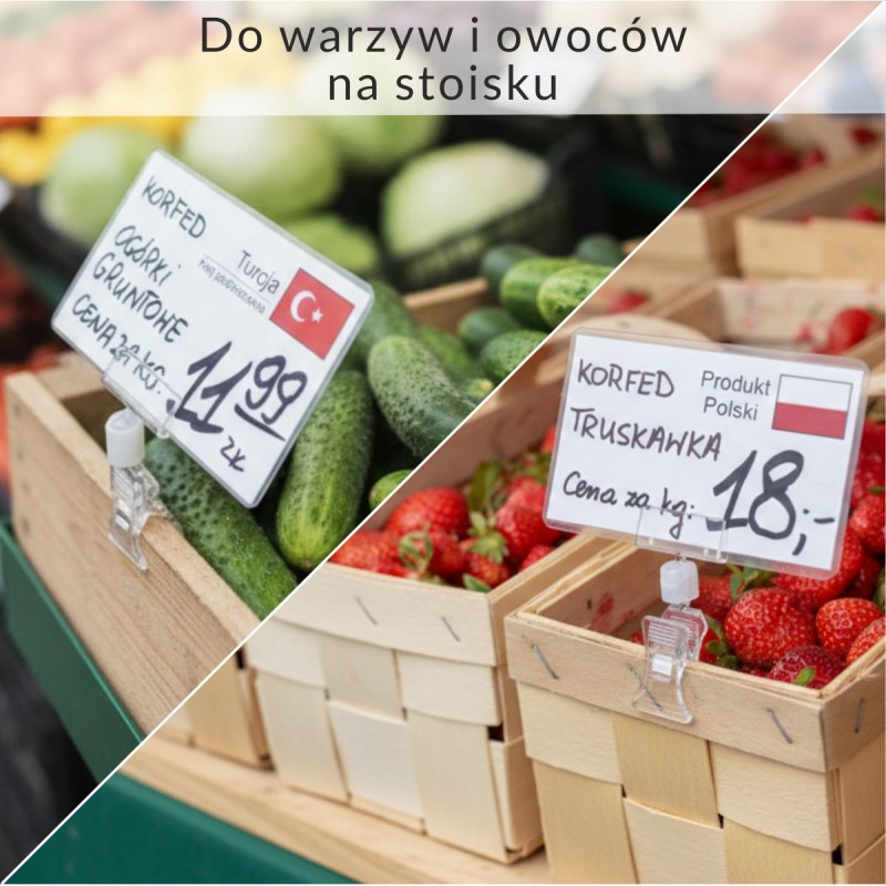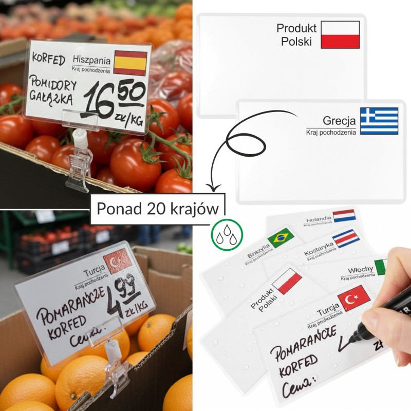 Zadbaj o profesjonalną ekspozycję towarów i pełną informację dla klienta dzięki naszym etykietom cenowym z flagami krajów. Wykonane z wysokiej jakości kartonu i zabezpieczone laminatem, stanowią idealne rozwiązanie dla sklepów spożywczych, warzywniaków oraz punktów gastronomicznych, gdzie liczy się estetyka i trwałość.