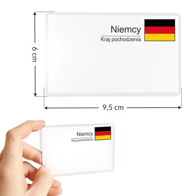Etykiety posiadają czytelną grafikę z flagą oraz nazwą kraju pochodzenia u góry, co pozwala na szybką identyfikację źródła produktu – zgodnie z aktualnymi wymogami handlowymi dotyczącymi wyraźnego oznaczenia graficznego kraju pochodzenia. Jasna informacja o pochodzeniu towaru to klucz do lojalności nowoczesnego konsumenta.