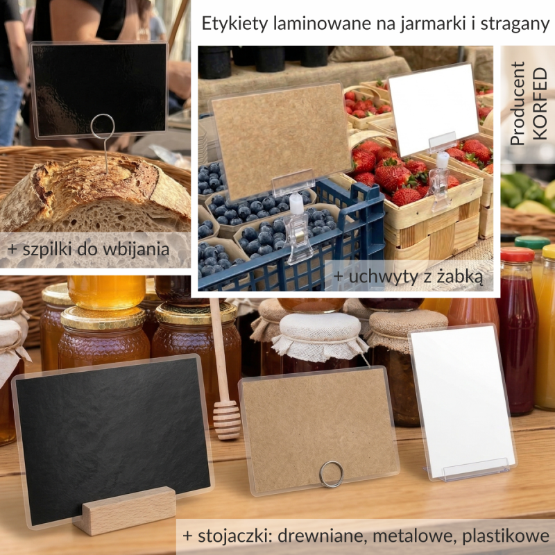Wskazówka od Producenta: Etykiety najlepiej prezentują się w dedykowanych uchwytach Korfed (żabki, szpilki, stojaczki). Unikaj mocowania ich "na siłę" w zbyt ciasnych szczelinach, aby nie naruszyć zgrzewu na krawędziach.